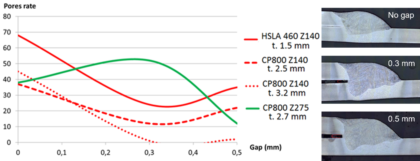 Figure 2: Pore rate in percent for different gap widths and steels (left) and cross-sections with increasing gaps (right). For normal coating level Z140, increasing the gap decreased pore and blowhole formation. Using a steel with significantly increased coating did not show this effect.