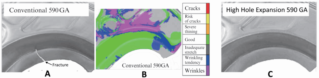 Figure 1: B-Pillar Upper stamped from 590 GA (a conventional galvannealed steel with 590 MPa minimum tensile strength, shown in A) and HHE 590 GA (a steel with 590 MPa minimum tensile strength engineered for high hole expansion, shown in C). The simulation of the conventional 590 GA does not indicate forming issues, as shown in image B. [Citations J-30, S-125]