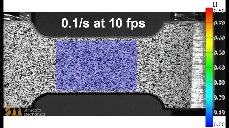 The most common optical method is digital image correlation (DIC). DIC correlates a series of images taken during the deformation of a specimen and calculates the corresponding strains of the specimen. It does this by tracking a black-and-white speckle pattern painted on the specimen’s surface which creates a series of high-contrast features as shown in Figure 6.